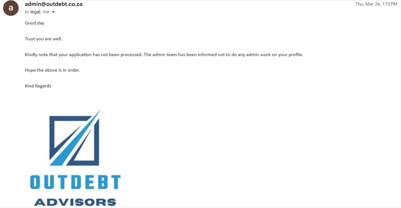 I followed it up with an official enquiry about Outdebt and the certified debt counsellor on their site.